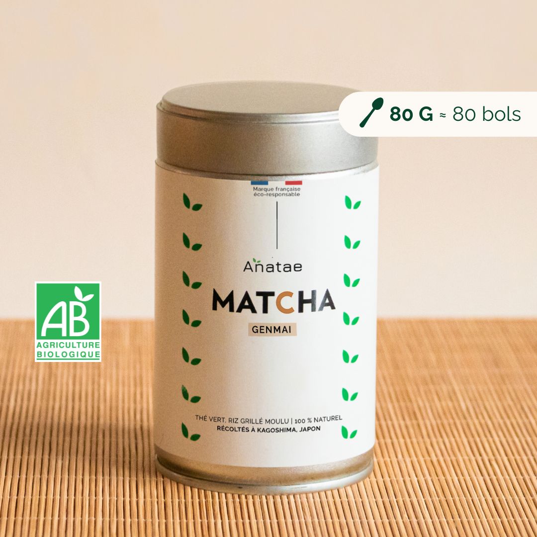 Mélange matcha + poudre de riz grillé bio (style genmaicha). Saveur unique réconfortante. Bio Certipaq.